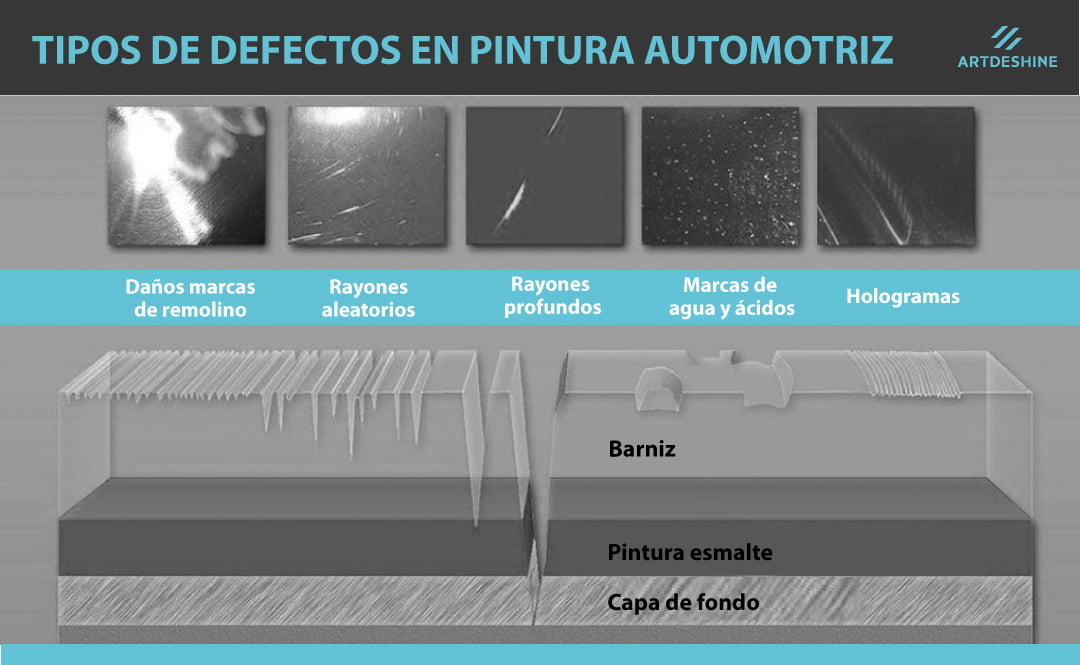 Estas imperfecciones de la superficie incluyen rasguños, hologramas (marcas de remolino), manchas de gotas secas, lluvia ácida, falta de transparencia, etc. Para minimizar estos daños y en muchos casos para eliminarlos usamos productos y equipos especializados. Previamente se lava profundamente la superficie con barras de arcilla y se mide el espesor del barniz para saber el nivel de pulido a aplicar.